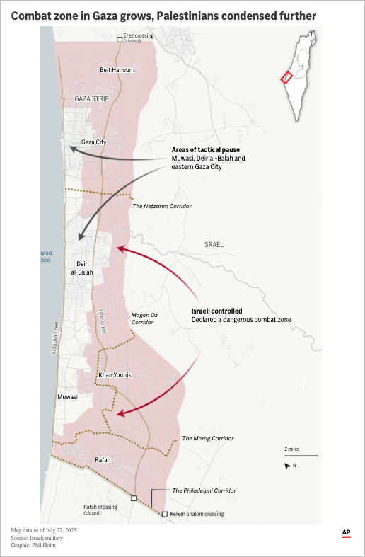 - Gaza City is one of only two major areas not currently under Israeli evacuation orders. The military already controls about 75% of the enclave and says Hamas is holding hostages there—its stated reason for avoiding a large-scale assault until now.