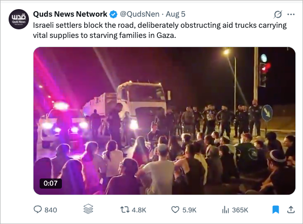 - Israelis continue to block aid convoys and slash tires on humanitarian trucks—without consequences. (The Jerusalem Post)