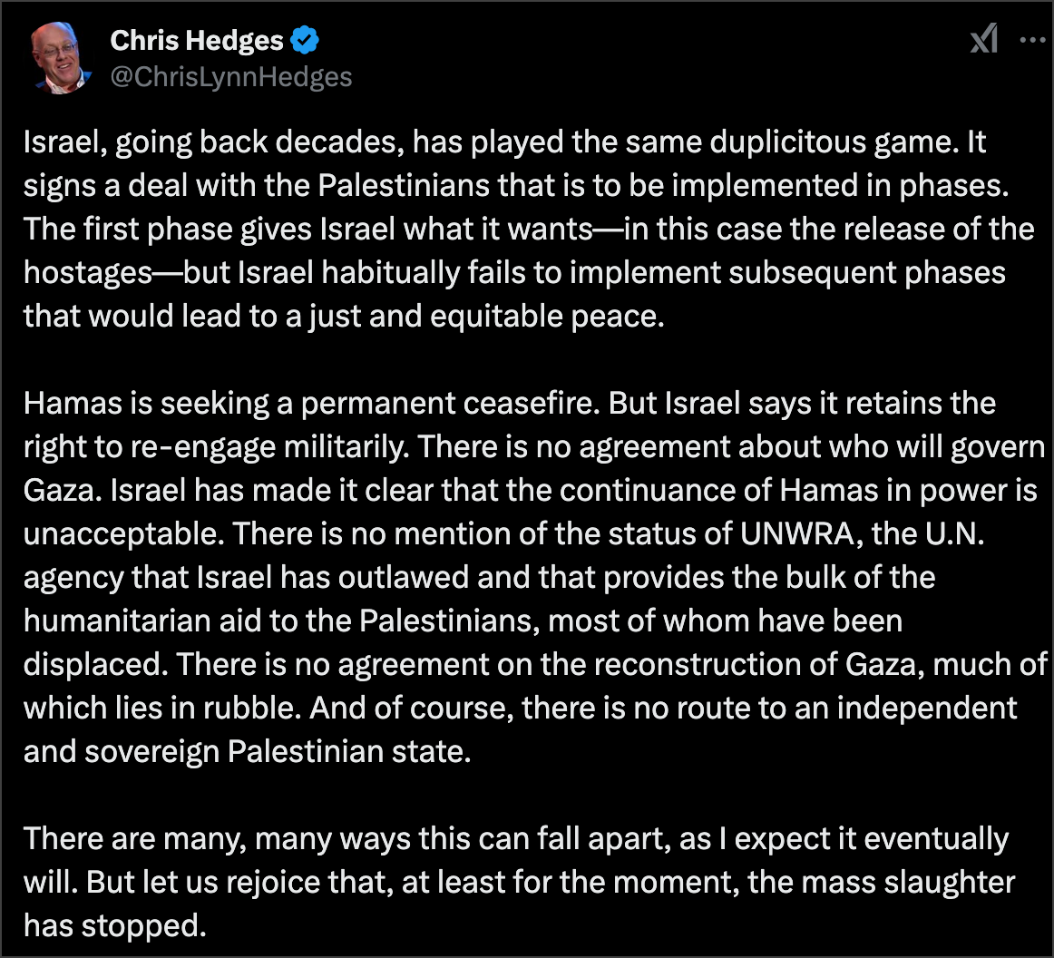 - Note: Hamas wants a complete Israeli withdrawal before releasing remaining hostages, which Israel has not agreed to. (Not sure how they claim to have an agreement when one of the biggest sticking points is... well, still stuck.)