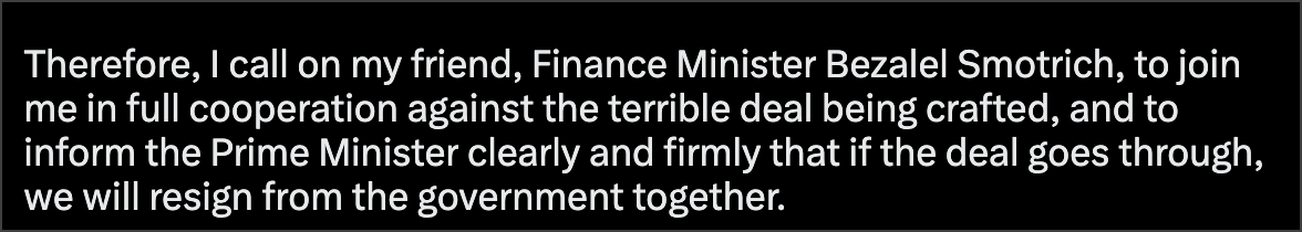 Israel's Minister Itmar Ben-Gvir admitted this week to sabotaging previous ceasefire deals. In a tweet on X this week, he said: