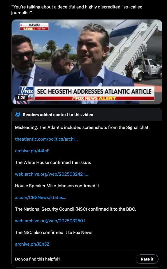 Hegseth offered the most effusive denials claiming that the details he shared on the chat about the strikes were not classified. Goldberg — who at this point had not released the entire contents of the chat — contradicted Hegseth’s claim.
