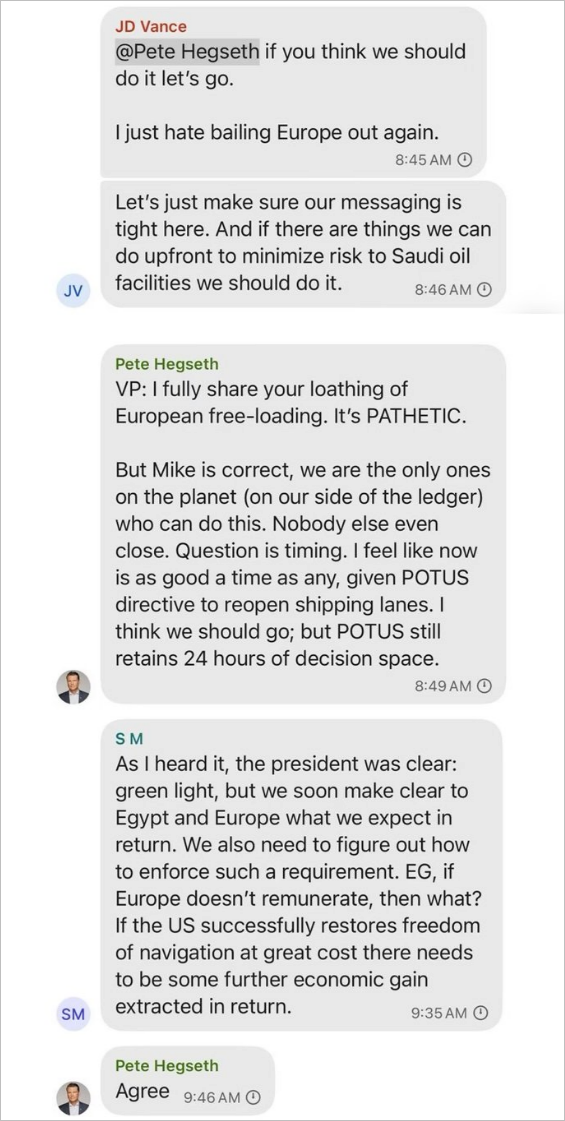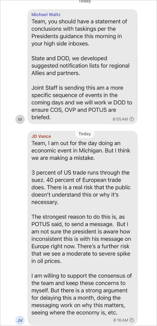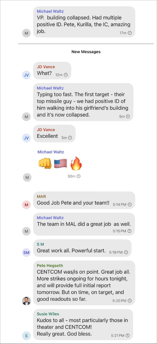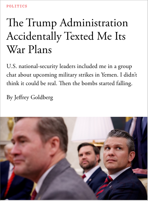 - OVERLOOKED CIVILIAN CASUALTIES: At least 53 people were killed in the Yemen strikes. The administration hasn’t clarified who the targets were. According to the chat, a Houthi engineer was seen entering his girlfriend’s apartment, which was then bombed. The building collapsed. How many civilians died? Was there no better opportunity to strike the target? Disturbingly, officials in the chat reacted with celebratory emojis instead of acknowledging the gravity of killing — even if justified — scores of civilians.