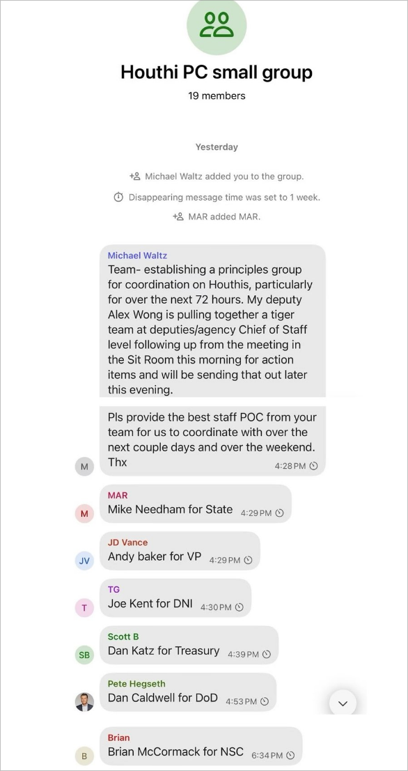 - RECORDS VIOLATIONS: Signal's "disappearing message" feature (initially set by Waltz to delete after one week and later extended to four) violates the Federal Records Act requiring all government communications be archived. How many other government communications have already been lost?