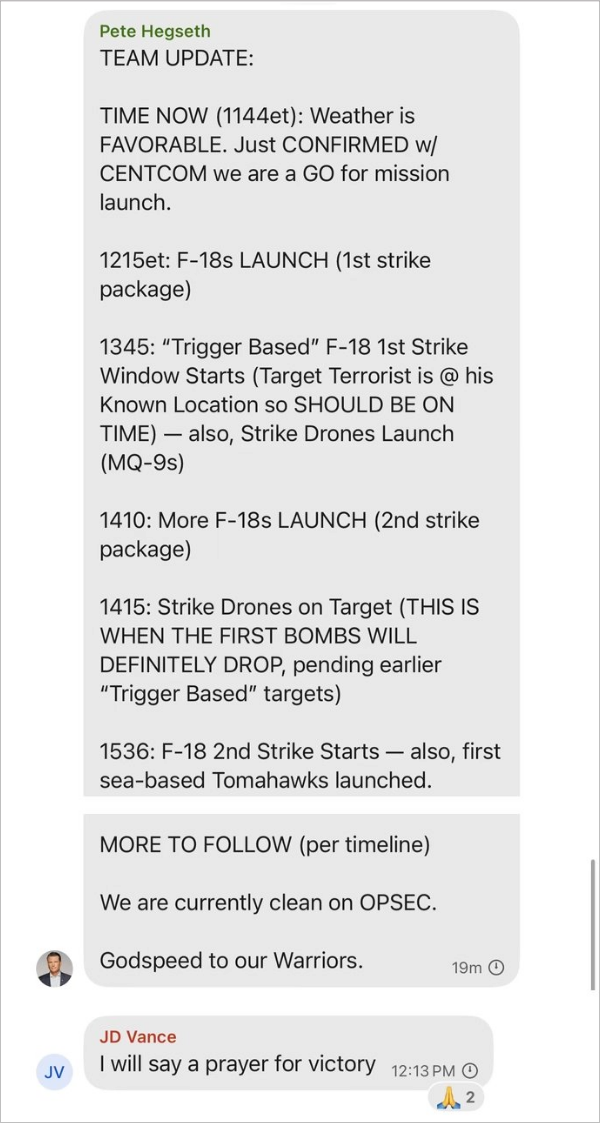 Meanwhile on Tuesday – in an odd coincidence I'm wondering might have had something to do with the timing of Goldberg's revelation – top intelligence officials were set to testify before Congress at the annual Worldwide Threats hearing. Lawmakers grilled DNI head Tulsi Gabbard and CIA chief John Ratcliffe — who were part of the 12 — about the chat, but both claimed they didn’t "recall" key details and downplayed its contents.