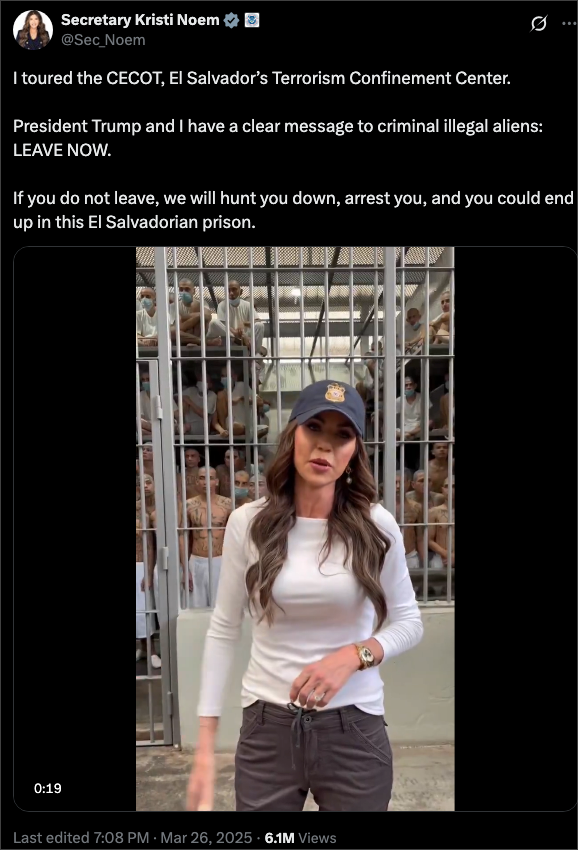 DHS Secretary Kristi Noem visited CECOT—El Salvador's notoriously harsh prison—where the administration has sent hundreds of Venezuelans accused of being Tren de Aragua gang members. Family members have filed lawsuits claiming their loved ones were targeted simply for having tattoos, with no evidence presented of gang affiliation.