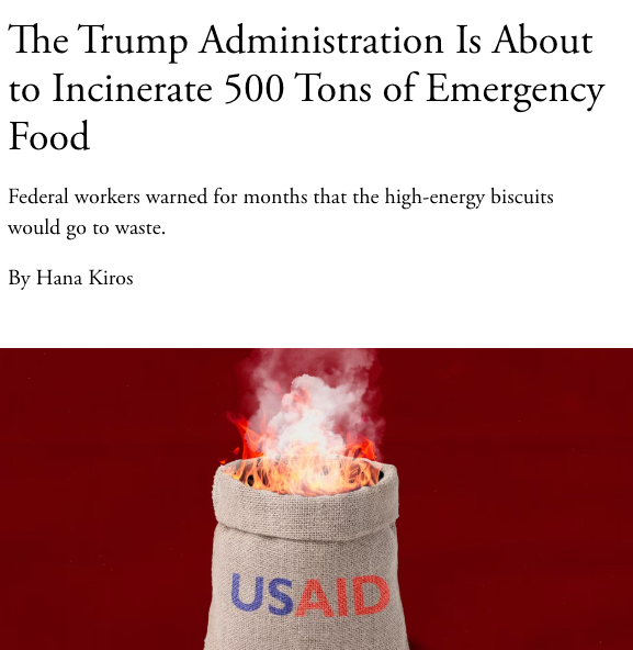 The Trump administration is set to burn over a million pounds of expired high-nutrition biscuits—originally paid for by U.S. taxpayers to feed 1.5 million malnourished children in Afghanistan and Pakistan, according to an investigation by The Atlantic (gift link). The biscuits expired after the State Department ignored requests from aid organizations to distribute them.