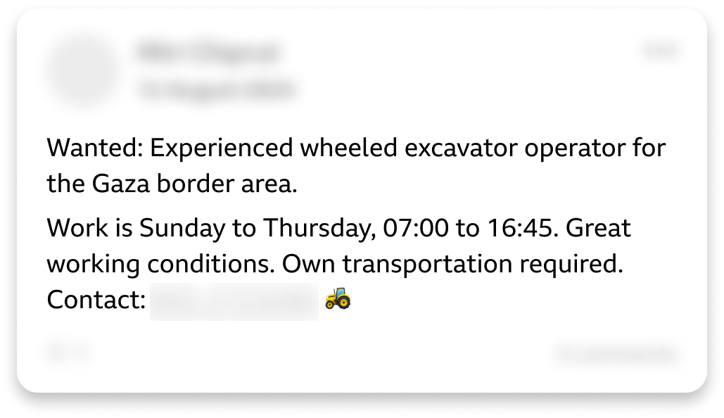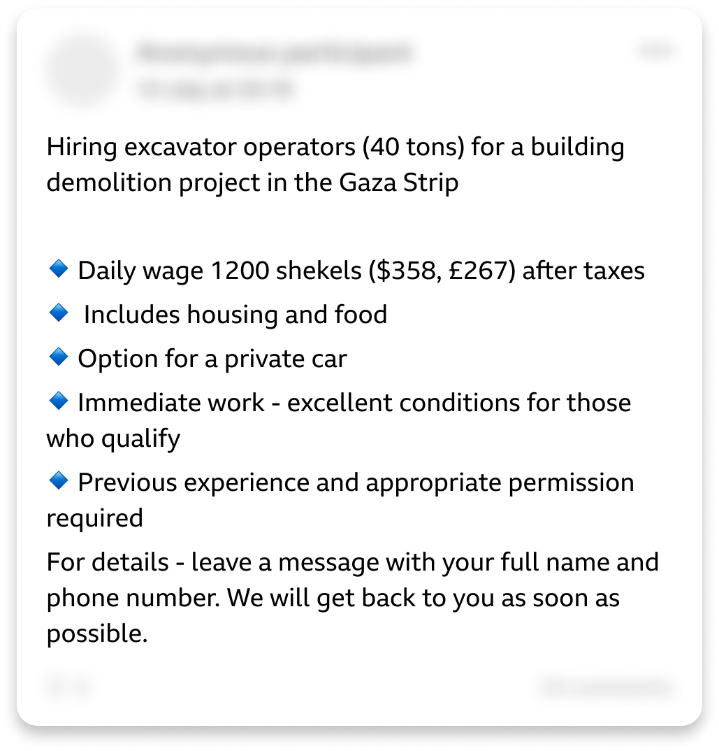- The BBC also “identified dozens of adverts posted to Israeli Facebook groups offering work in Gaza to demolition contractors. The majority of the posts have been shared by recruiters since May.”