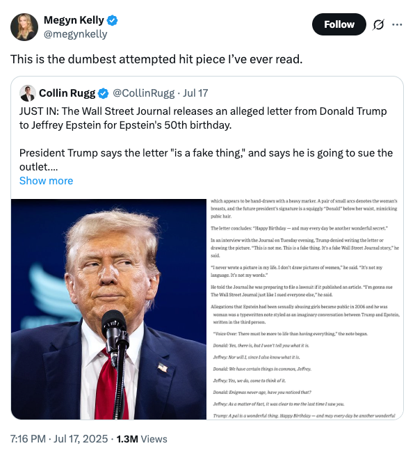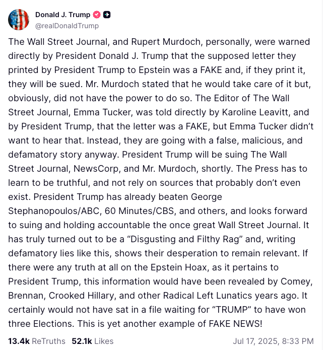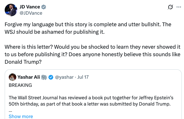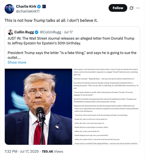 - Trump pivoted to his reliable “fake news” defense—accusing the WSJ of fabricating the story to make him look bad. MAGA, for now, took the bait.