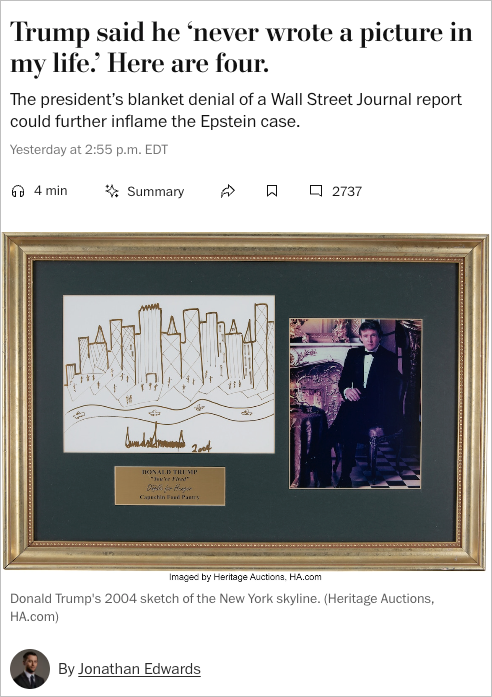 - The Wall Street Journal (gift link) reported that Trump wrote Epstein a “bawdy” letter for his 50th birthday in 2003. The letter was included in a collection compiled by Epstein’s partner, Ghislaine Maxwell, and bound into a book as a gift.