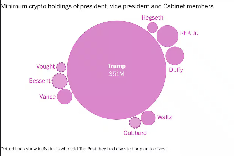- Thanks to Trump and his administration, crypto is booming — with Bitcoin hitting an all-time high this week, doubling in value since last year. They’re cashing in, too: nearly 70 Trump officials — including the president himself — hold a combined $193 million in crypto assets.In contrast, no one in the Biden Administration held crypto. (Washington Post)