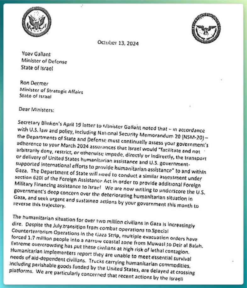 The US warning came in a letter from Secretary of State Antony Blinken and Defense Secretary Lloyd Austin, directed to Israeli officials. The letter demanded that Israel increase the number of aid trucks entering Gaza to 350 per day, giving Israel 30 days to respond. This is not the first such warning; the US has previously cautioned Israel about the humanitarian crisis but has not pulled funding that includes arms and ammunition for Israel’s use in Gaza.