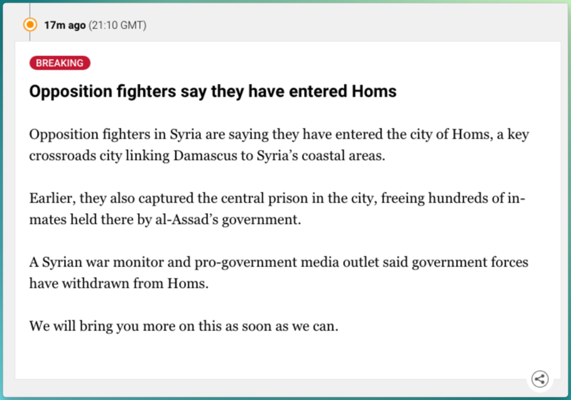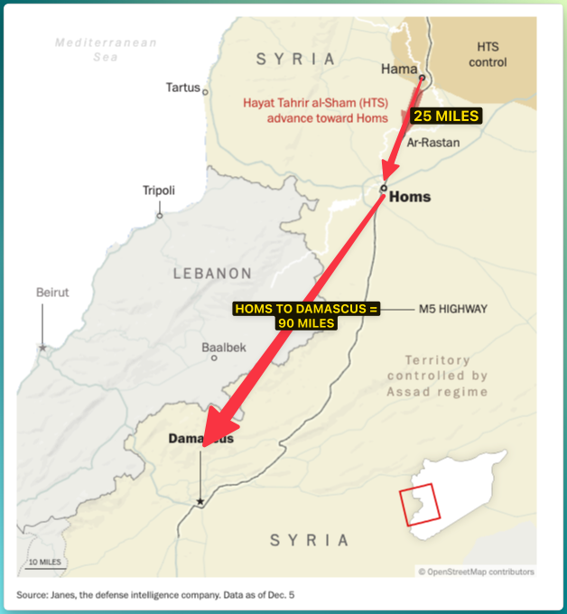 The rebels' latest push began the day after the ceasefire between Israel and Hezbollah was brokered. Since then, the rebels have captured Hama and Aleppo — two of the country’s largest cities this week by catching Assad’s forces off guard. Now, the rebels are making their way to the key city of Homs, which is crucial for controlling routes between Damascus and the coastal regions.