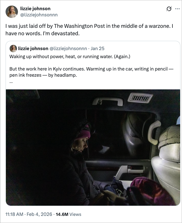 - Jeff Bezos's Washington Post laid off hundreds of journalists — roughly one-third of the newsroom. Entire beats were eliminated: the Middle East desk, the sports section, the books section, every staff photographer. A reporter covering the war in Ukraine was let go. Another already in Italy for the Olympics was sent home.