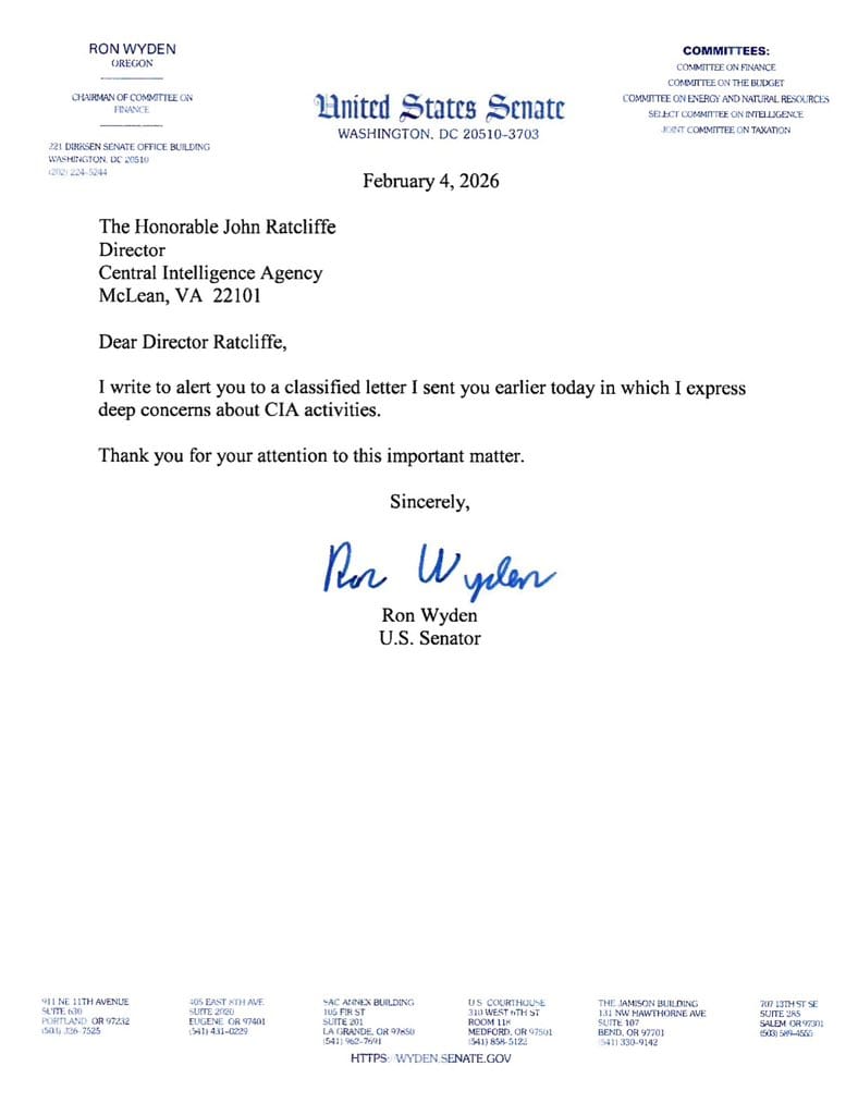 Sen. Ron Wyden (D-OR), the longest-serving member of the Senate Intelligence Committee, sent a two-sentence letter to CIA Director John Ratcliffe this week: "I write to alert you to a classified letter I sent you earlier today, in which I express deep concerns about CIA activities. Thank you for your attention to this important matter."
