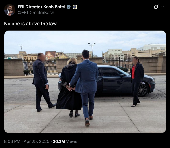 #2 The FBI arrested sitting Wisconsin judge Hannah Dugan on Friday for allegedly helping an immigrant evade ICE. The government alleges that earlier this month, Judge Dugan helped an immigrant appearing in her court on battery charges escape through a private jury entrance to avoid agents waiting outside the courtroom. Unlike Donald Trump — who was allowed to surrender himself — Dugan was arrested in public and handcuffed, despite not being considered a flight risk. She has been released on bond and says she will defend herself “vigorously.” Washington Post