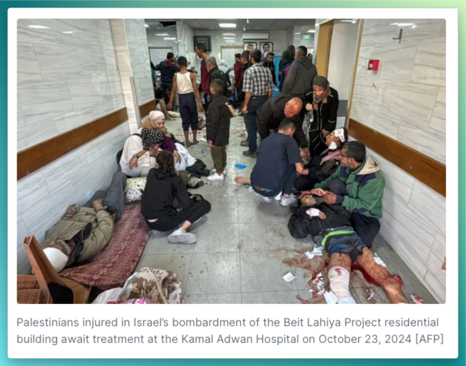 - Kamal Adwan Hospital, the last operating hospital in the north, has faced intense fire for three weeks. The director reports that Israeli forces have targeted the hospital and ambulances. Israeli strikes on the hospital's oxygen machine and ICU equipment led to two children’s deaths. As of Friday evening, communications at the hospital were cut off and witnesses reported IDF gunfire inside the hospital.