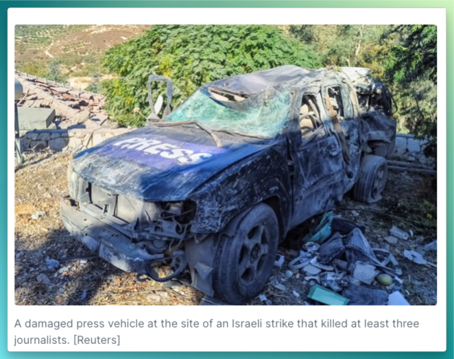 Last year, Israeli forces struck and killed Reuters journalism Issam Abdallah and maimed and wounded several others in southern Lebanon. The journalists were in a wide open area and had been there for hours, with Israel’s knowledge.