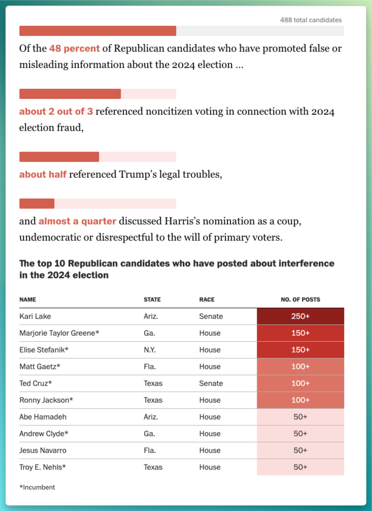 - How hundreds of Republicans — including almost half of the Republican candidates for office this year — have taken Trump’s lead to cast doubt on the elections from The Washington Post
