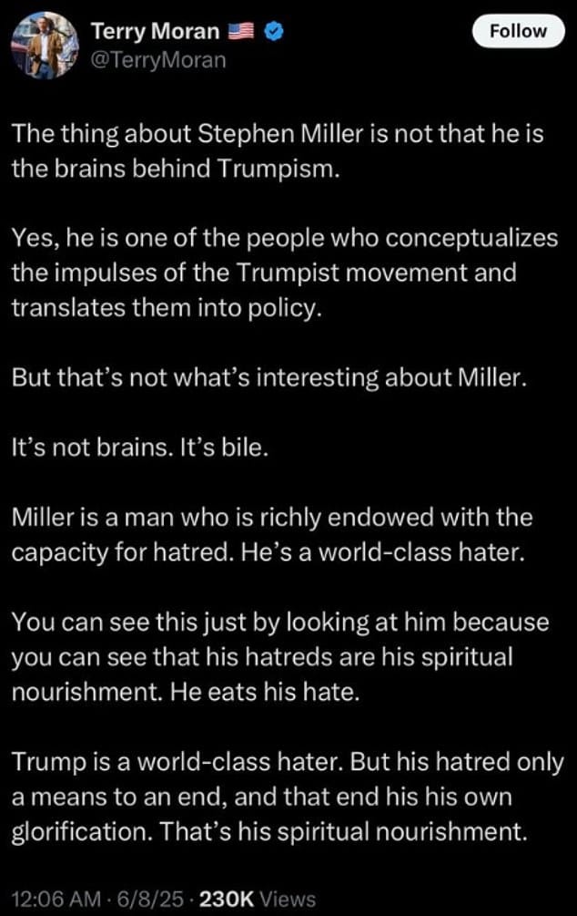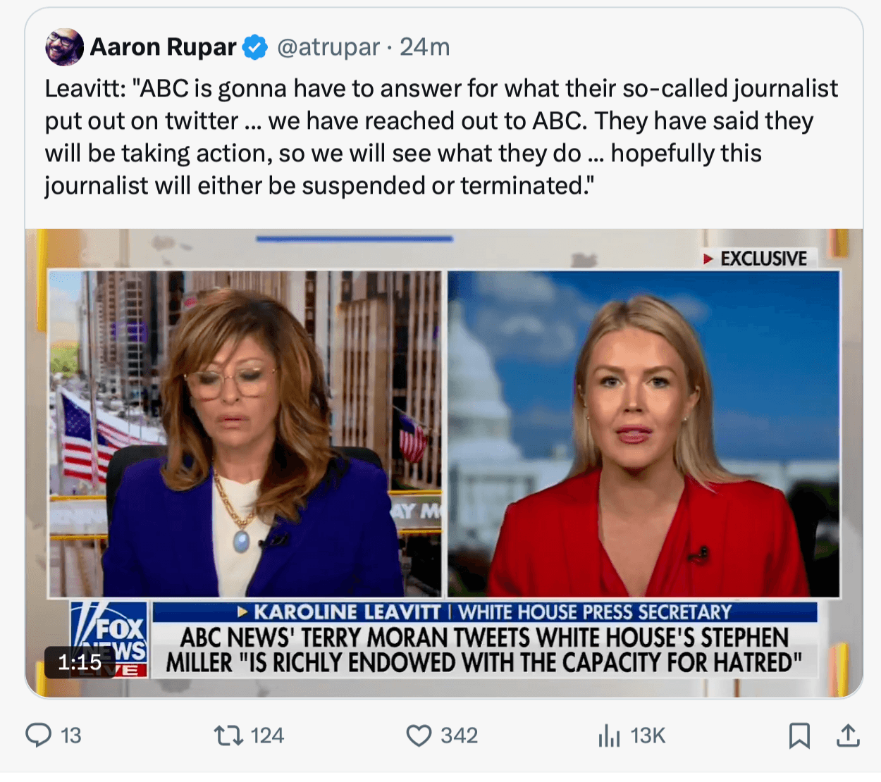 ABC News fired Terry Moran, a 28-year veteran correspondent, after the Trump White House questioned how the network would “hold him accountable” for a social media post calling Trump and advisor Stephen Miller “world class” haters. ABC insists the decision was internal, but it comes just months after the network paid Trump $15 million to settle a frivolous defamation lawsuit—raising concerns that the press is being bullied into silence by the administration. (WSJ)