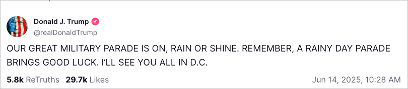 Trump is marking his 79th birthday with the largest military show of force in Washington since 1991—a $45 million parade featuring 6,700 troops, tanks, flyovers, and fireworks, under the banner of the Army’s 250th anniversary. The event began at 11 a.m. ET, with Trump joining at 6:30 p.m. It ends with a mass enlistment ceremony and parachute jump by the Golden Knights.