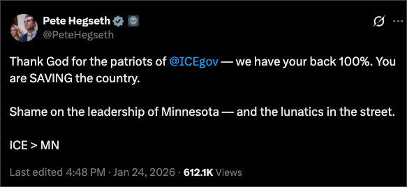 Defense Secretary Pete Hegseth implied his loyalty is to his comrades in government, not the people of Minnesota.