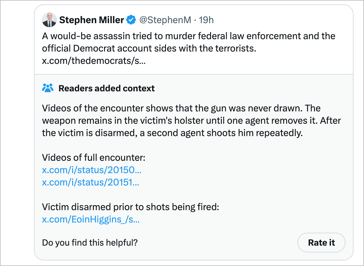 Hours after the shooting, before any investigation had begun, White House Deputy Chief of Staff Stephen Miller called Pretti a "would-be assassin" who "tried to murder" federal agents.