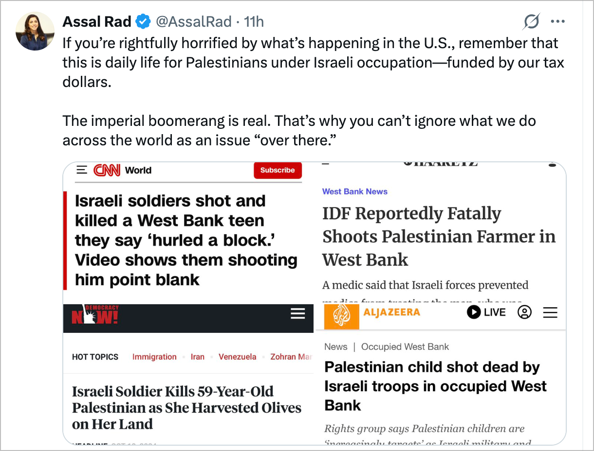 - What ceasefire? Israel killed more than a dozen Palestinians this week, including three journalists—one of whom worked for CBS News. Israel has killed hundreds during this so-called ceasefire. [Reuters, 1/21/26]