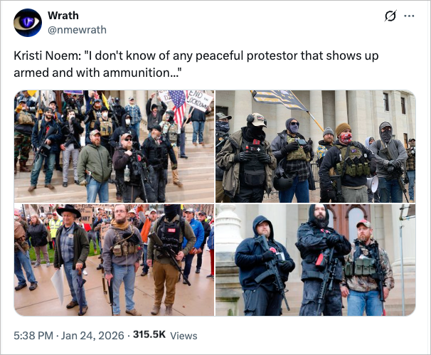 Homeland Security Secretary Kristi Noem—who repeatedly and falsely claimed Pretti "brandished" a gun—doubled down: "I don't know of any peaceful protester that shows up with a gun and ammunition rather than a sign."