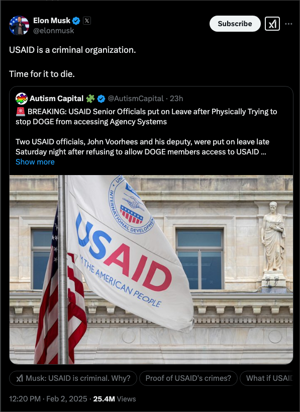 “The episode over the weekend had added to the speculation that Trump would attempt to abolish the agency or merge it into the State Department and underscores the role of unelected figures — led by Musk, the richest man in the world — in the administration’s push to remake the federal government. It also highlights the new administration’s more transactional view of global engagement and its determination to refocus public spending on activities that yield tangible impacts for U.S. citizens.” - The Washington Post