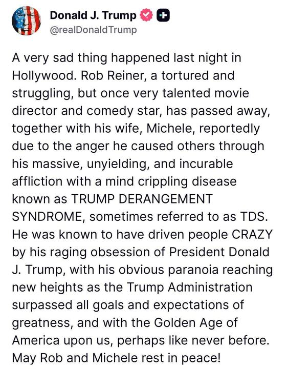 - On Monday, Trump falsely claimed on social media that Hollywood director Rob Reiner had been murdered because of “TRUMP DERANGEMENT SYNDROME.” His son Nick — who has long struggled with addiction and mental health issues — was later arrested and charged.